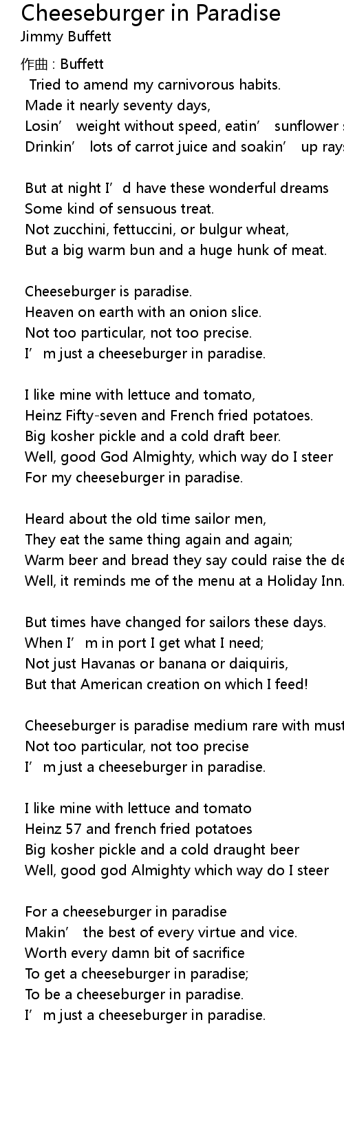 | Cheeseburger is paradise medium rare with mustard’d be nice | |