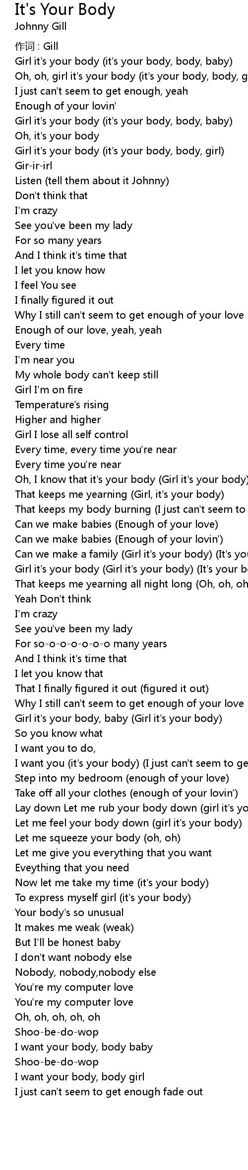 | Why I still can' t seem to get enough of your love Girl it' s your body | |
