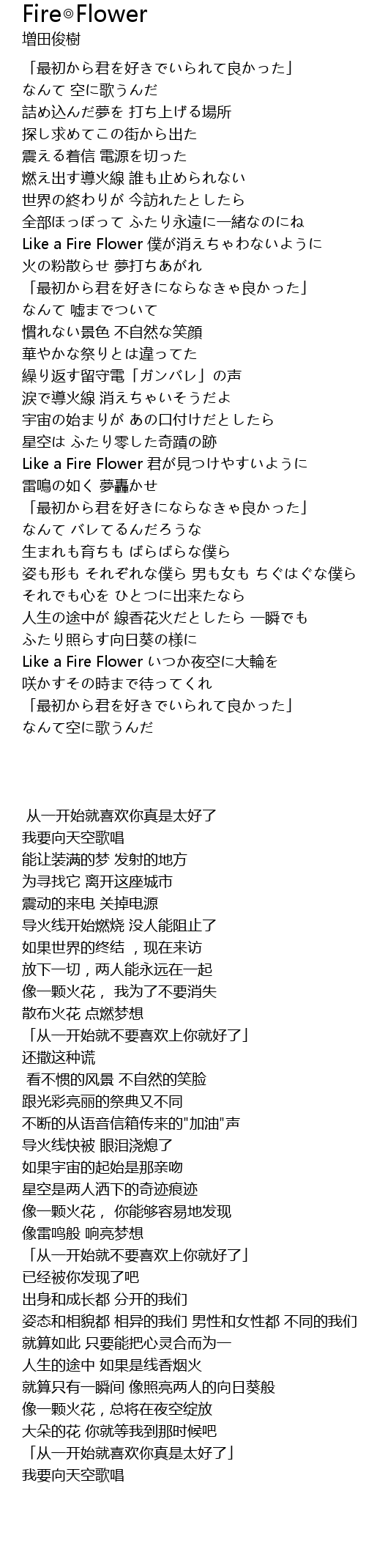 | [00:59.160] | Like a Fire Flower 僕が消えちゃわないように |