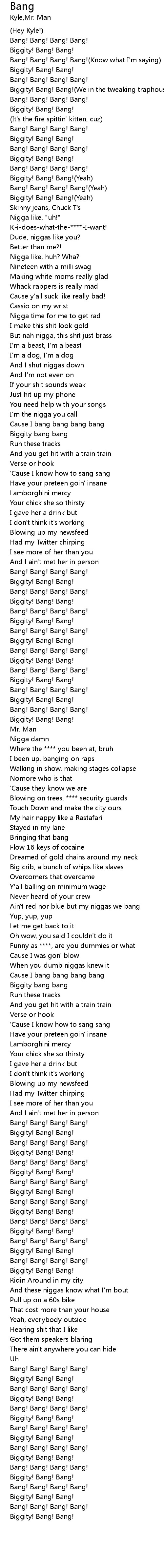 | [00:14.98] | Bang! Bang! Bang! Bang!(Know what I'm saying) |