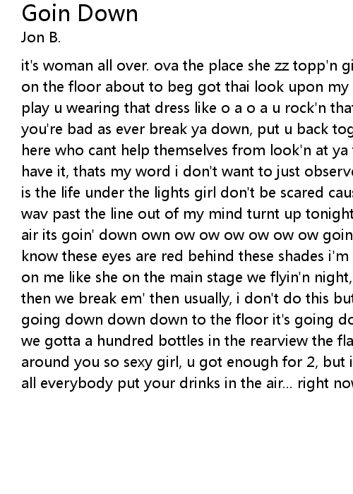 it's woman all over. ova the place she zz topp'n girl she got them leg's got me on the floor about to beg got thai look upon my face, u know i ain't come to play u wearing that dress like o a o a u rock'n that hair like o a o a damn girl you're bad as ever break ya down, put u back together it's a hundred dude's in here who cant help themselves from look'n at ya the spotlight is on her gotta have it, thats my word i don't want to just observe wanna get u open to see this is the life under the lights girl don't be scared cause all the people in here wav past the line out of my mind turnt up tonight look at all the drink in the air its goin' down own ow ow ow ow ow ow goin' down own ow ow ow ow ow down u know these eyes are red behind these shades i'm st tu tu tuttering she put that on me like she on the main stage we flyin'n night, sky scraping, make the rule then we break em' then usually, i don't do this but u left me no choice it's going down down down to the floor it's going down down go'n and drink some more we gotta a hundred bottles in the rearview the flashing light's are everywhere around you so sexy girl, u got enough for 2, but i'm selfish so, girl, i want it all everybody put your drinks in the air... right now