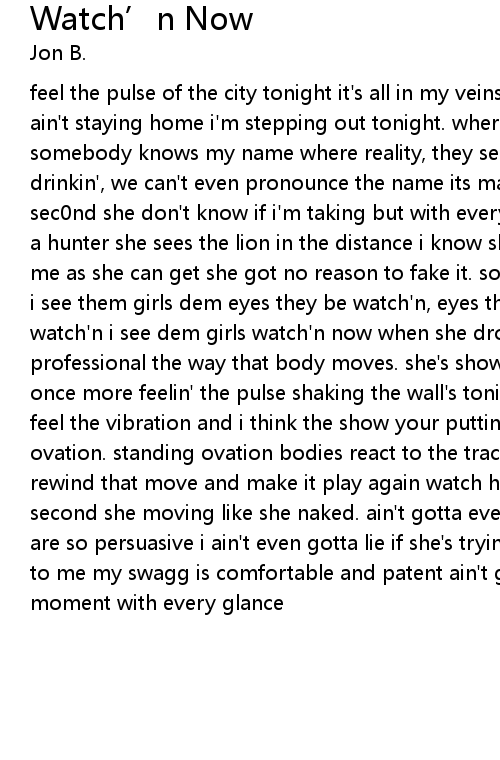 feel the pulse of the city tonight it's all in my veins. all in my veins ya i ain't staying home i'm stepping out tonight. where somebody knows my name somebody knows my name where reality, they serve it on a plate and what we drinkin', we can't even pronounce the name its making me feel better every sec0nd she don't know if i'm taking but with every move i make she's on me like a hunter she sees the lion in the distance i know she's trying to be as close to me as she can get she got no reason to fake it. so i know she gon' take a chance i see them girls dem eyes they be watch'n, eyes they be watch'n eyes they be watch'n i see dem girls watch'n now when she drop it on the floor like a professional the way that body moves. she's showing what it do bring it back once more feelin' the pulse shaking the wall's tonight u can feel the vibration. feel the vibration and i think the show your putting on deserves a standing ovation. standing ovation bodies react to the track, the dj's playin' ladies rewind that move and make it play again watch her make it look better every second she moving like she naked. ain't gotta even take off a thing those eyes are so persuasive i ain't even gotta lie if she's trying. but this ain't nothing to me my swagg is comfortable and patent ain't got no reason to fake it kodak moment with every glance