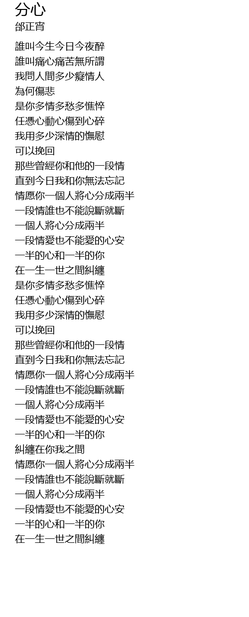 | [02:34.29] | 情愿你一個人將心分成兩半 |