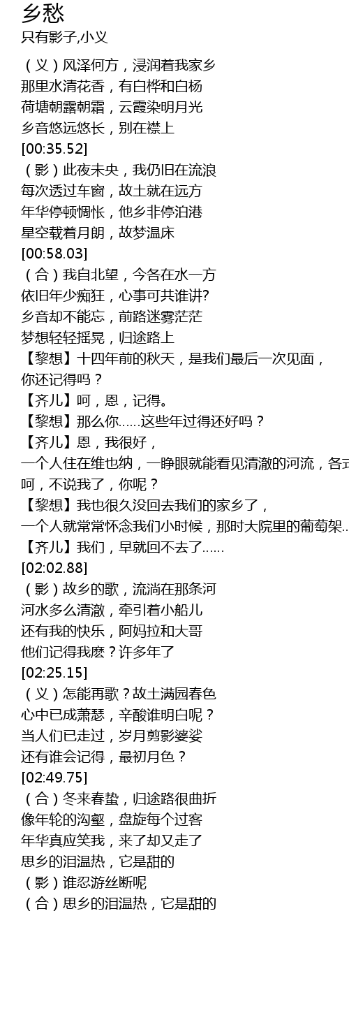 | [02:04.36] | (影)故乡的歌,流淌在那条河 |