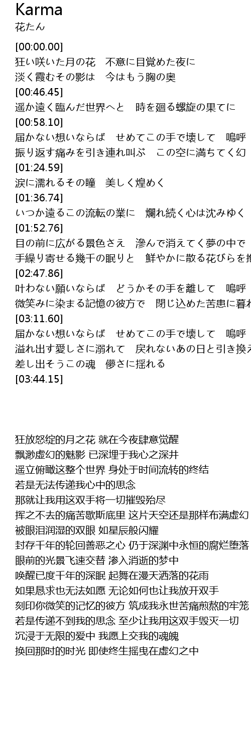 | [01:37.15] | いつか遠るこの流転の業に 爛れ続く心は沈みゆく |