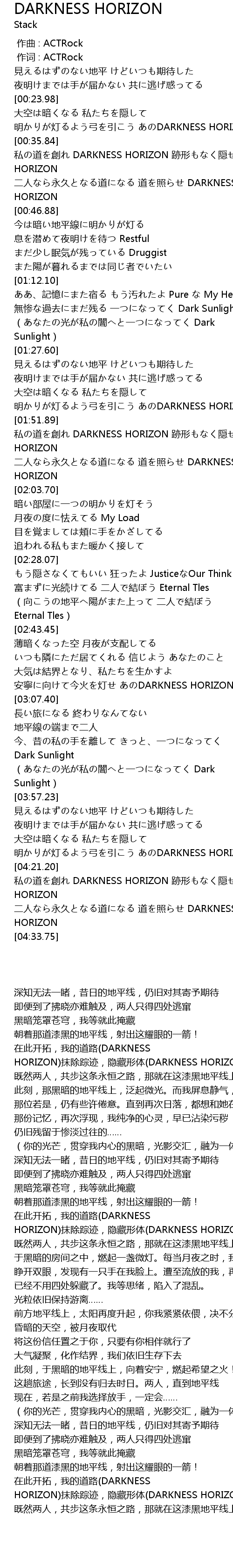 | [04:21.33] | si dao chuang DARKNESS HORIZON ji xing yin DARKNESS HORIZON |