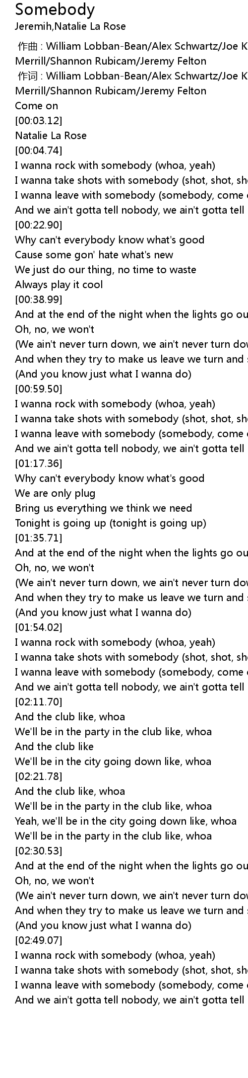 | [02:03.23] | I wanna leave with somebody (somebody, come on, come on) |