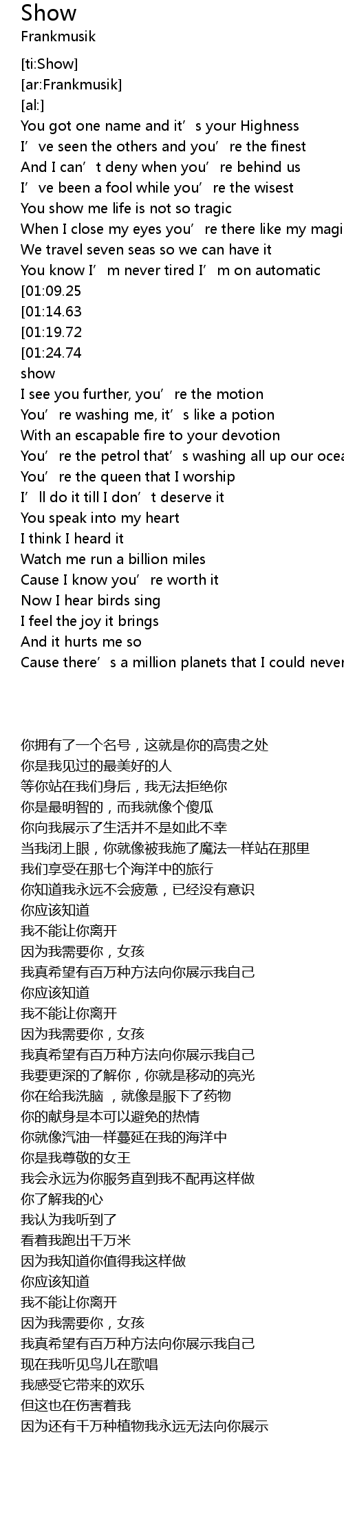 | [02:28.68][01:24.74][01:03.33] | I wish there was million ways that I could I could show |