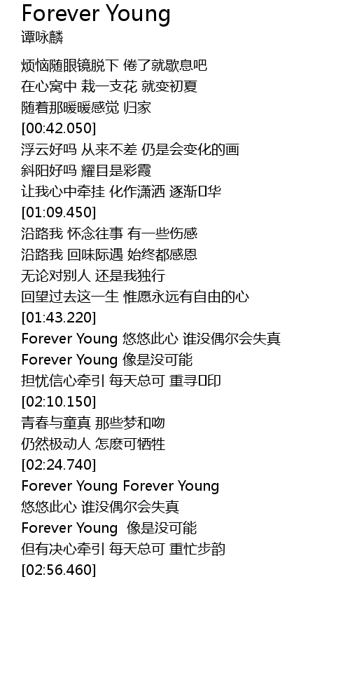 | [01:44.490] | Forever Young you you ci xin shui mei ou er hui shi zhen |