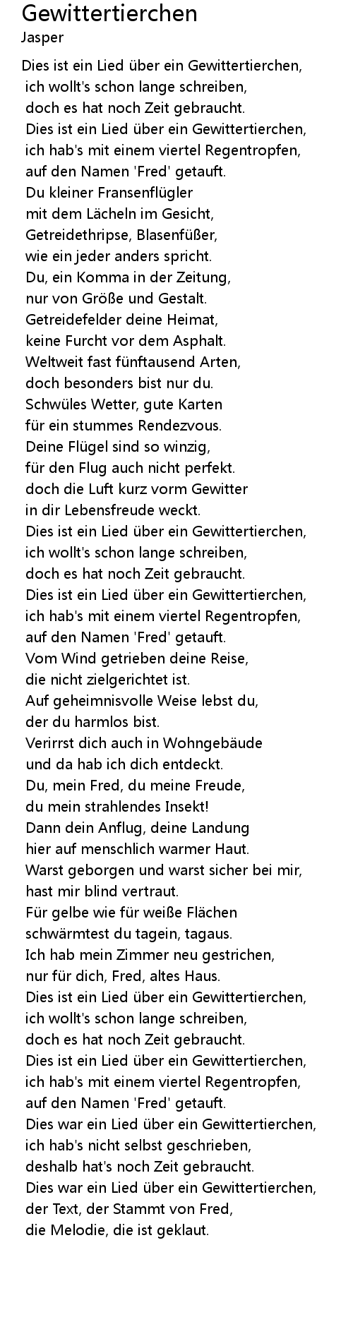 | Dies war ein Lied über ein Gewittertierchen, | |