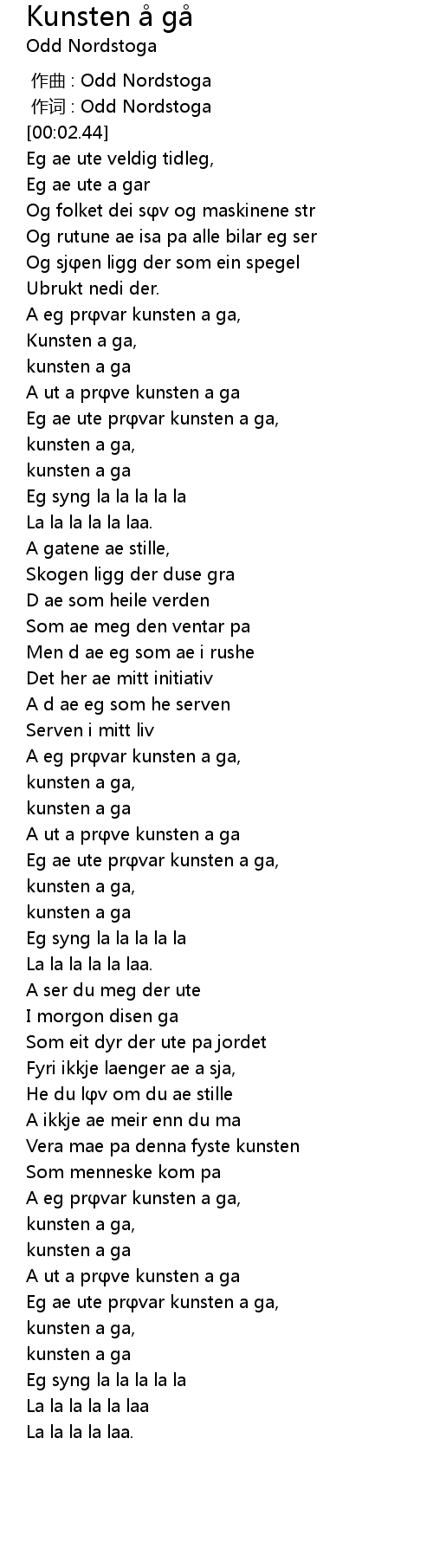 | [01:44.33] | Eg ae ute pr var kunsten a ga, |
