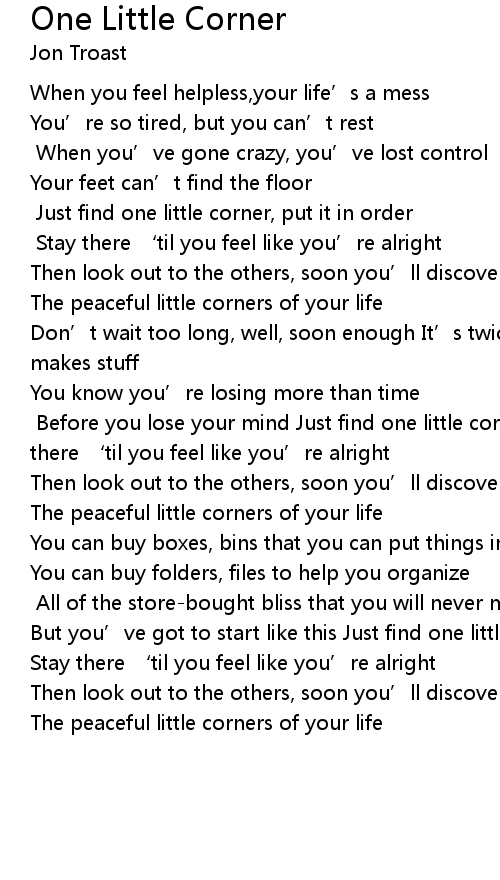 | Before you lose your mind Just find one little corner, put it in order Stay there ' til you feel like you' re alright | |