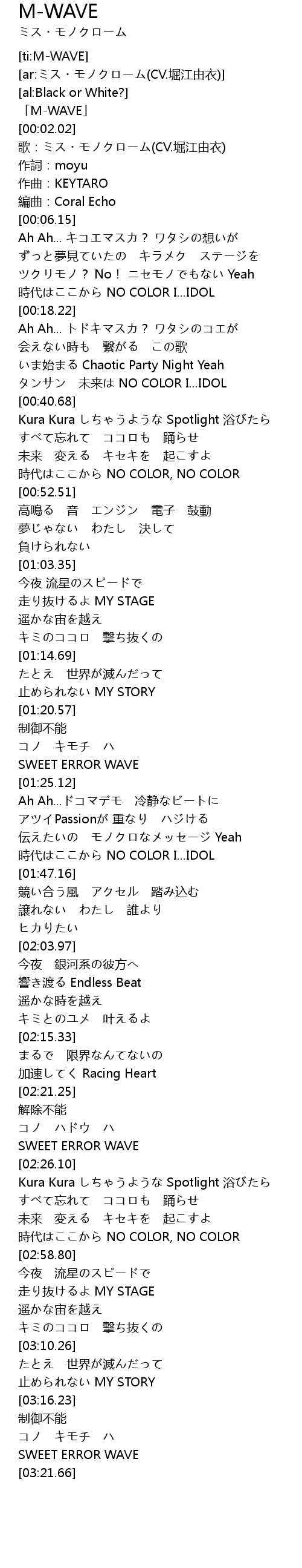 | [00:02.70] | 歌:ミス・モノクローム(CV.堀江由衣) |