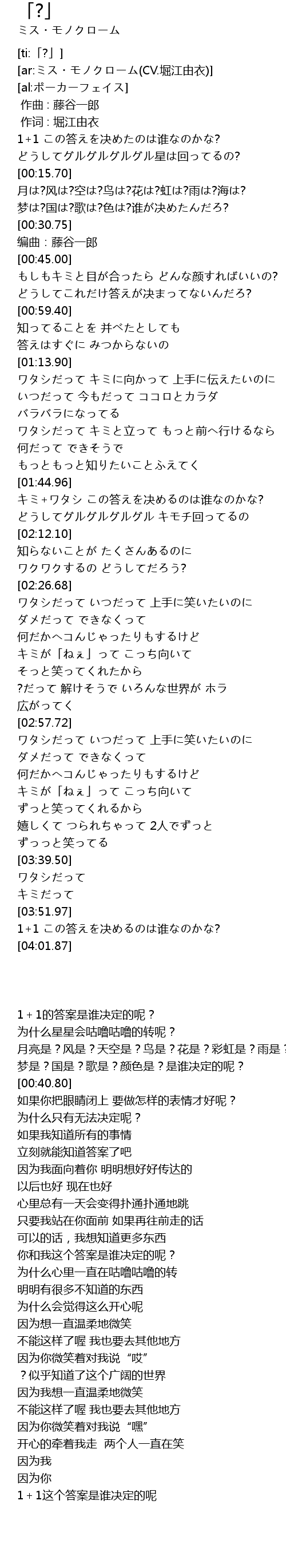 | [03:54.49] | 1+1 この答えを决めるのは谁なのかな? |
