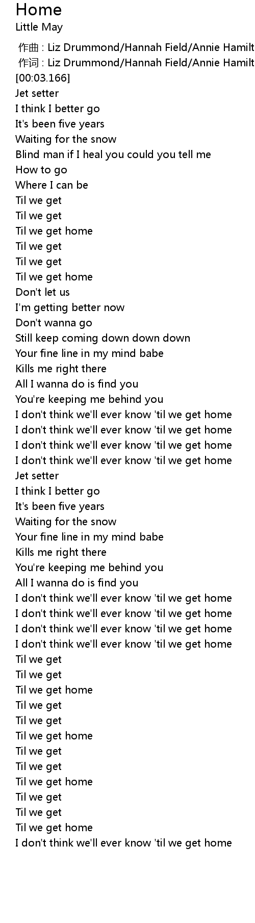 | [01:35.390] | I don' t think we' ll ever know ' til we get home |