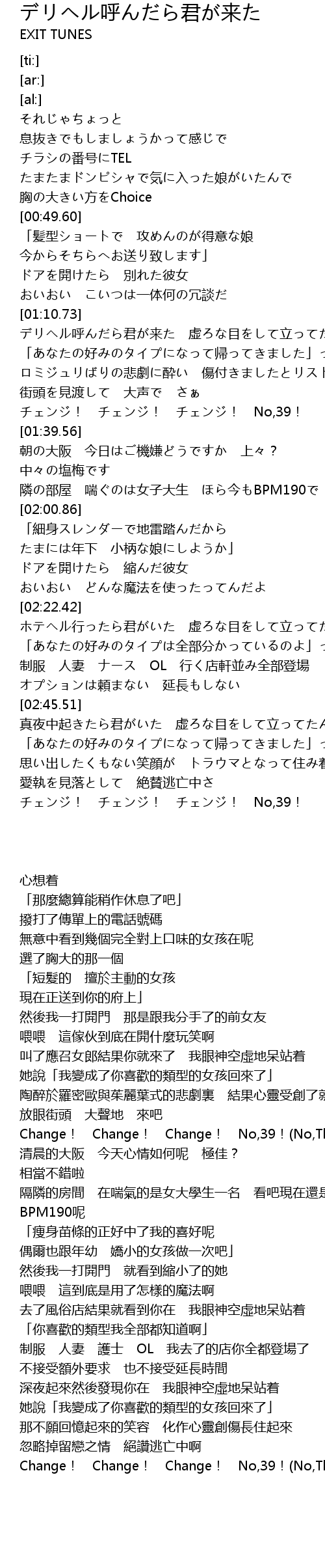 | [01:11.97] | デリヘル呼んだら君が来た 虚ろな目をして立ってたんだ |