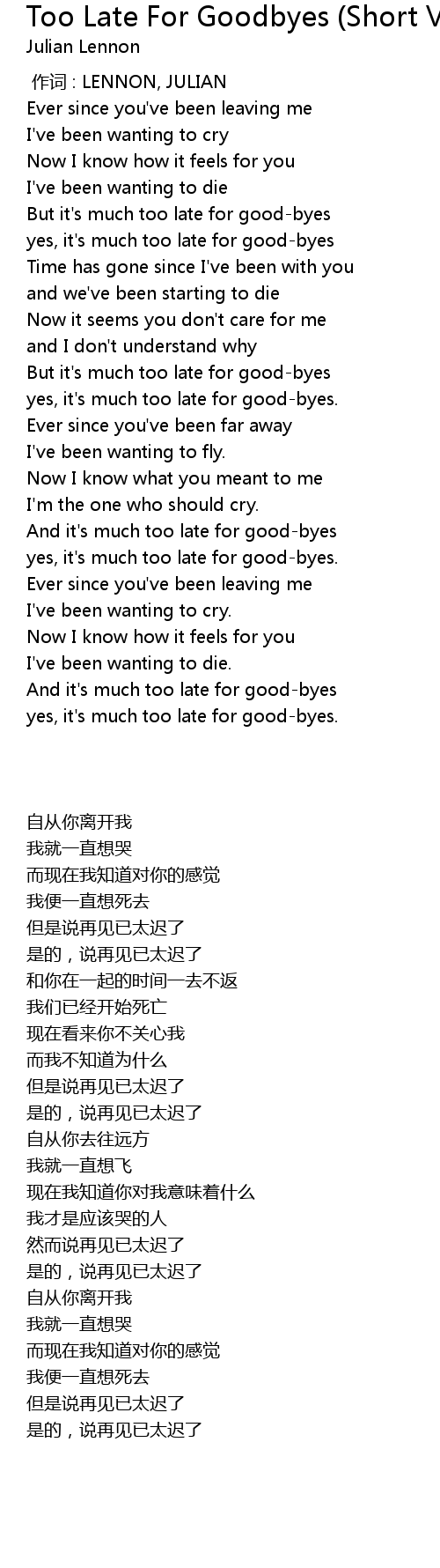 | [00:46.59] | But it' s much too late for goodbyes |
