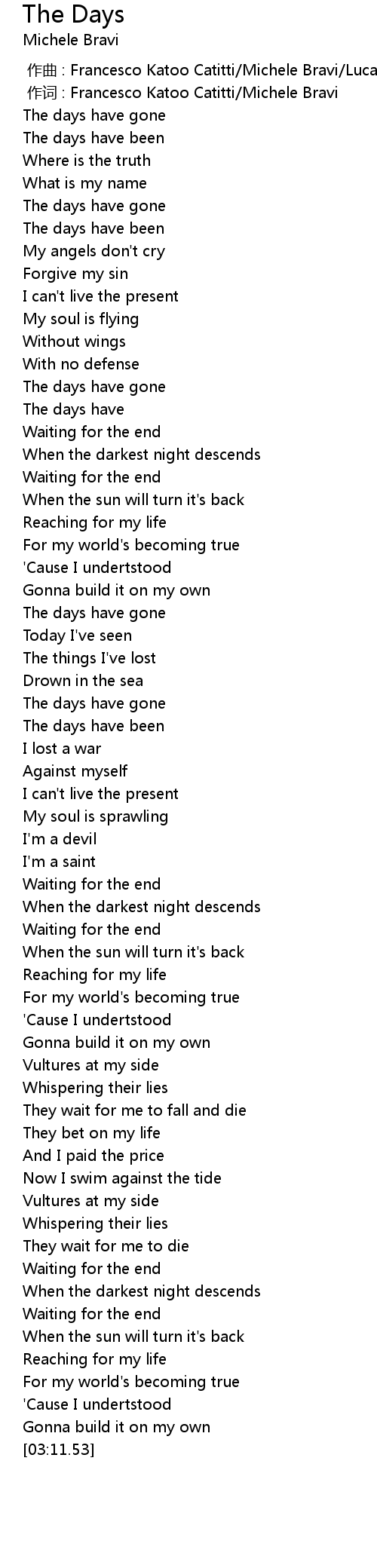| [00:11.64] | The days have gone |