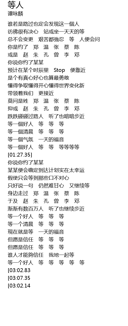 | [03:11.92][03:02.83][02:53.52] | děng yī gè hǎo rén děng děng děng |