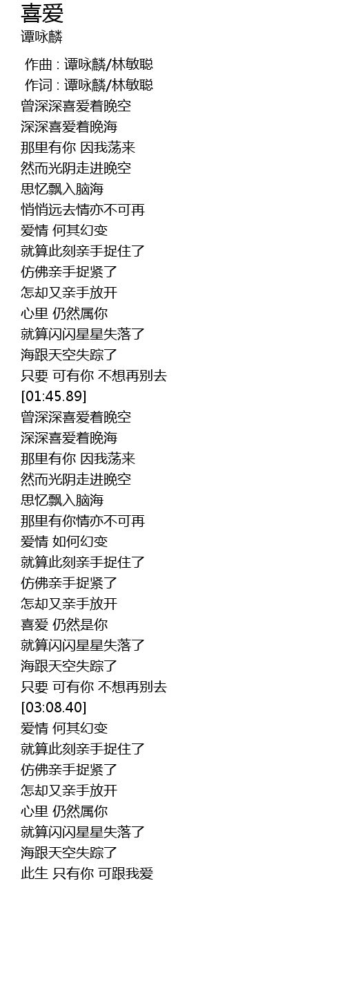 | [00:01.00] | 作词 : 谭咏麟/林敏聪 |