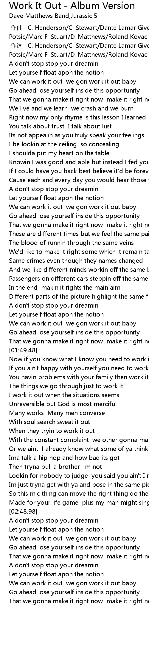 | [00:01.00] | 作词 : C. Henderson/C. Stewart/Dante Lamar Givens/Mark Ali Potsic/Marc F. Stuart/D. Matthews/Roland Kovac |
