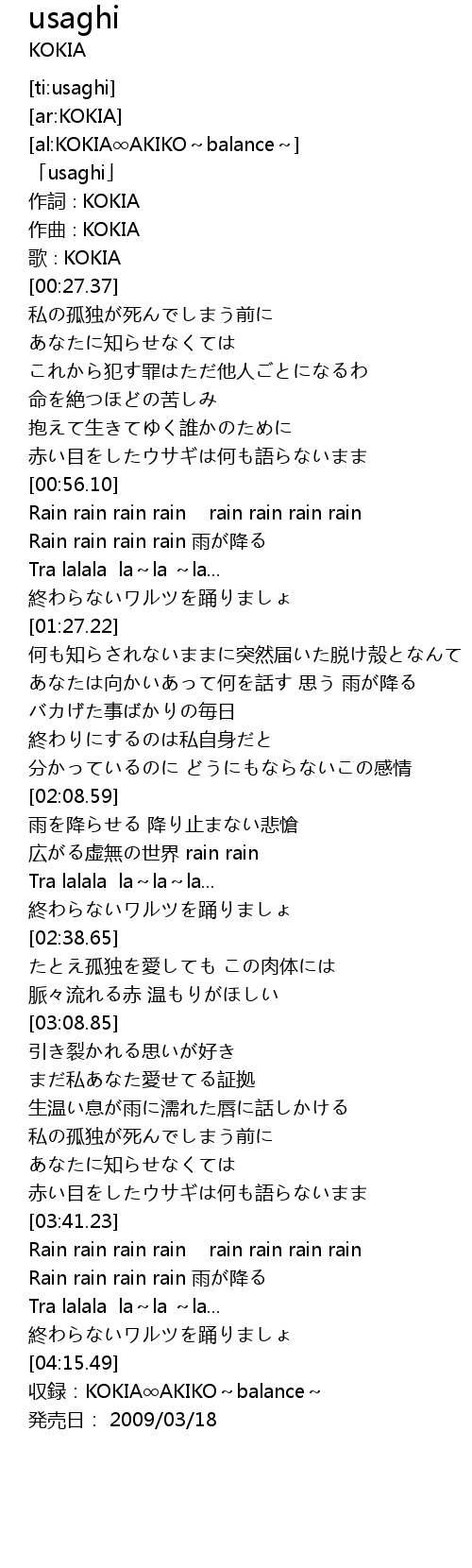 | [04:18.49] | 収録:KOKIA∞AKIKO~balance~ |