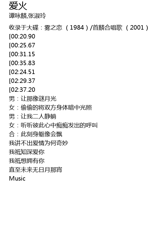 | [00:09.00] | 收录于大碟:雾之恋 (1984)/首麟合唱歌 (2001) |