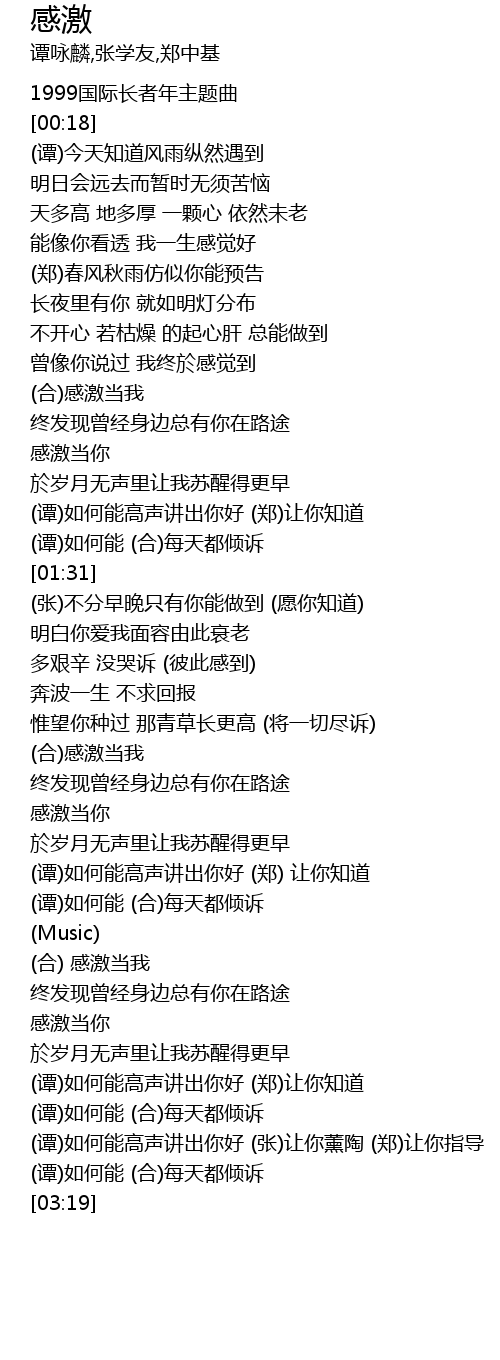 | [03:08] | (谭)如何能高声讲出你好 (张)让你薰陶 (郑)让你指导 |