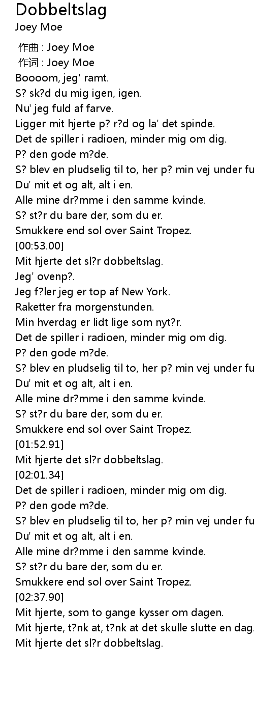 | [01:54.94] | Mit hjerte det sl?r dobbeltslag. |