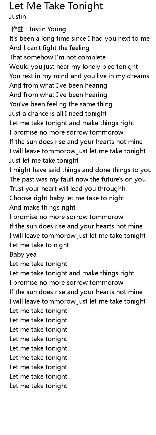 | [01:13.19] | I will leave tommorow just let me take tonight |