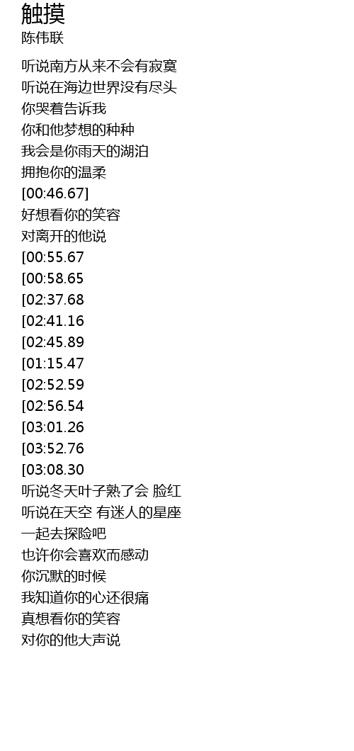 | [03:22.89][02:37.68][01:02.66] | qīng qīng chù mō wèi lái yáo yuǎn de fēng |