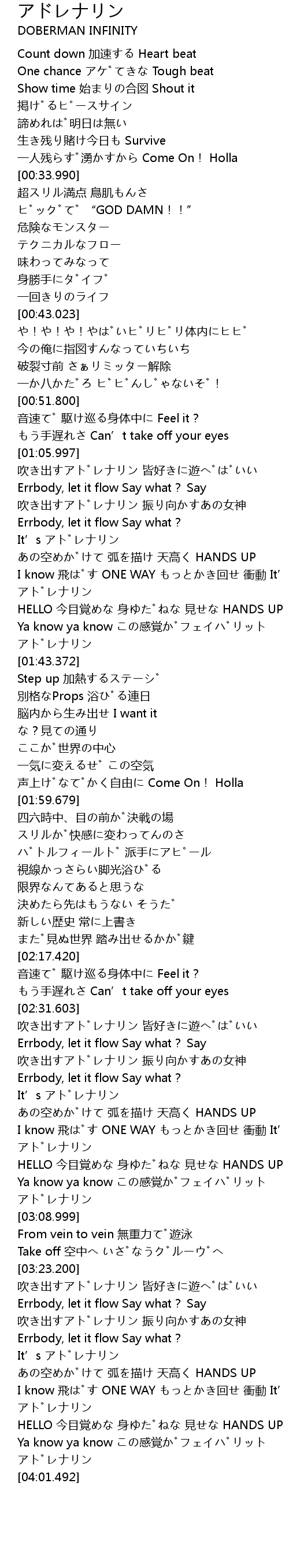 | [03:59.098] | Ya know ya know この感覚がフェイバリット アドレナリン |