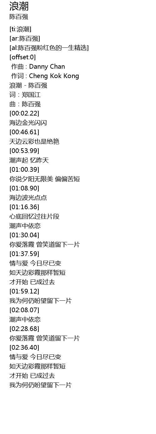 | [00:00.10] | 浪潮 - 陈百强 |