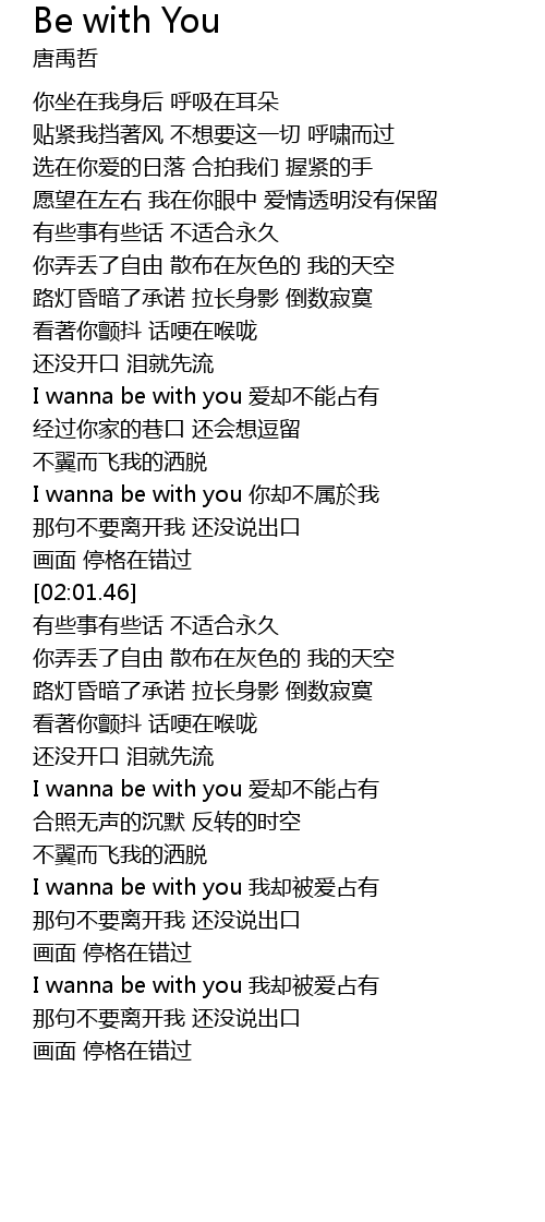 | [01:36.47] | I wanna be with you ni que bu shu yu wo |