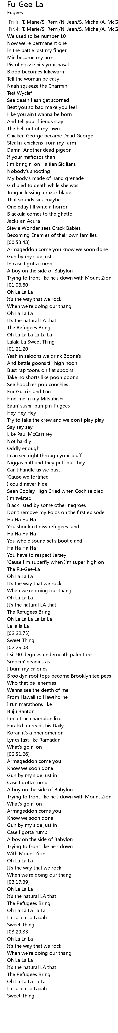 | [01:34.47] | Eatin' sushi bumpin' Fugees |