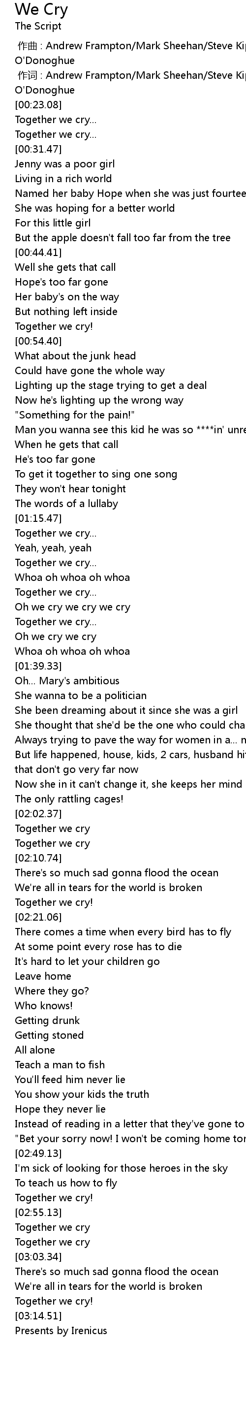 | [00:01.00] | 作词 : Andrew Frampton/Mark Sheehan/Steve Kipner/Glen Power/Daniel O'Donoghue |