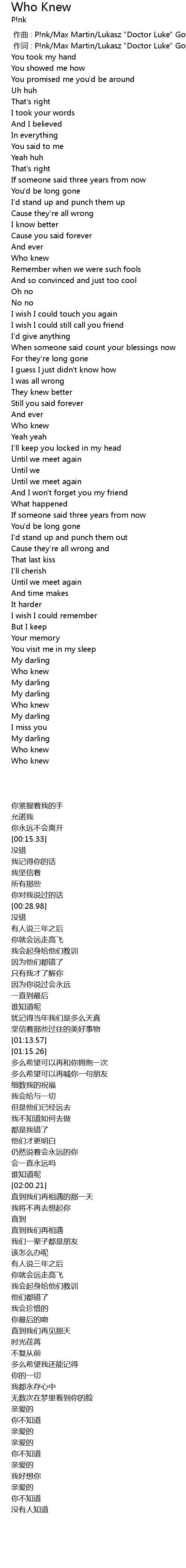 | [00:01.00] | zuò cí : P! nk Max Martin Lukasz " Doctor Luke" Gottwald |