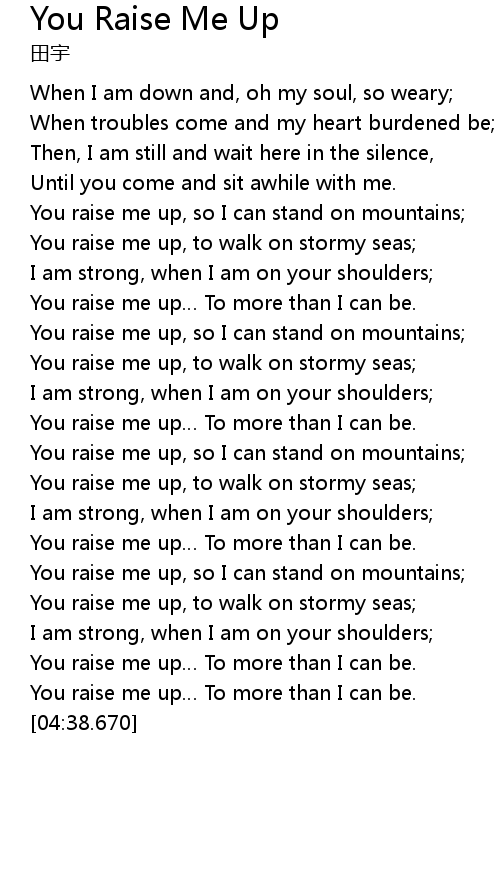 | [02:37.720] | You raise me up, so I can stand on mountains |