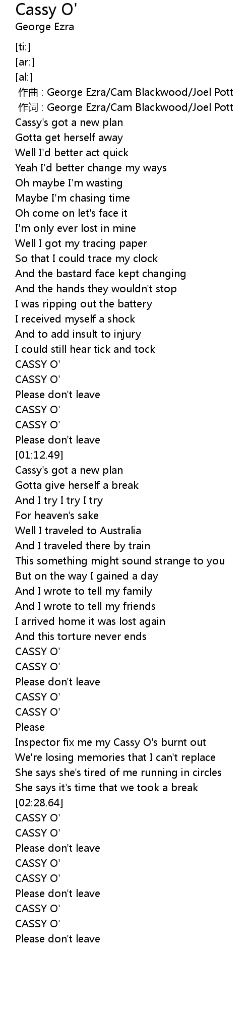 | [00:01.00] | zuo ci : George Ezra Cam Blackwood Joel Pott |