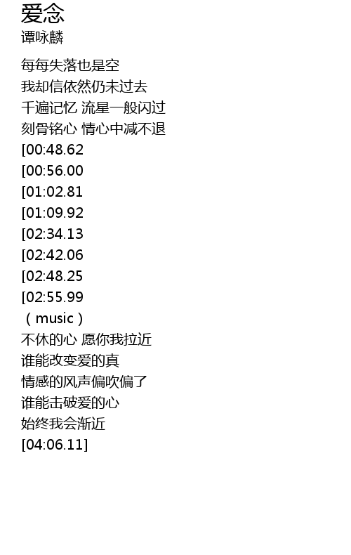 | [03:44.42][02:55.99][01:42.59] | 若是你真心 始终我会渐近 |