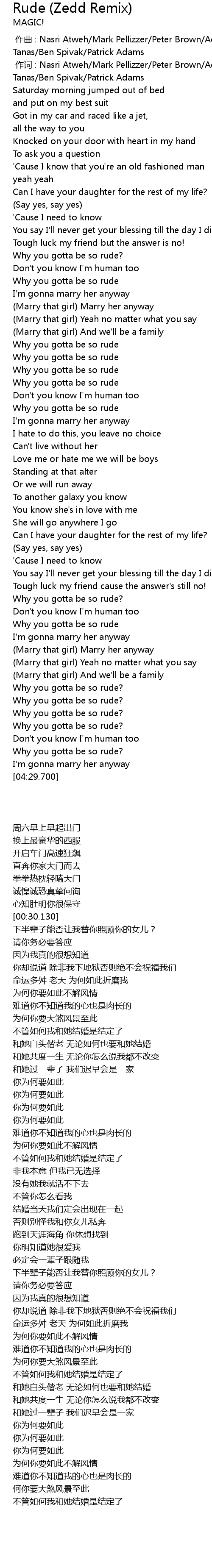 | 歌曲 | Rude (Zedd Remix) |