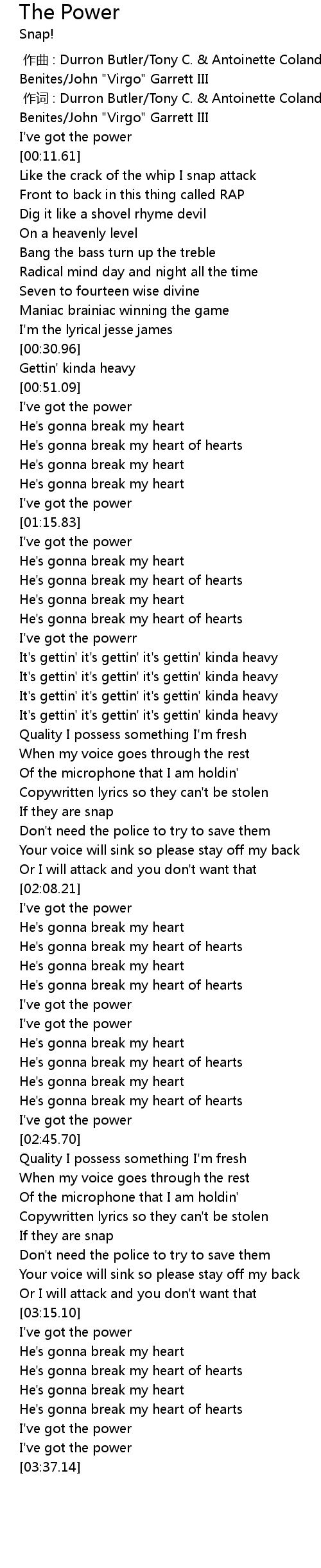 | [00:01.00] | 作词 : Durron Butler/Tony C. & Antoinette Colandreo/Benito Benites/John "Virgo" Garrett III |