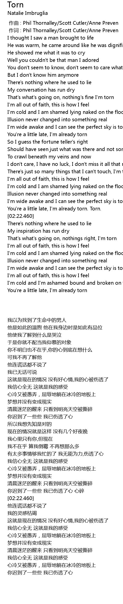 | [02:07.360] | You're a little late, I'm already torn. Torn. |