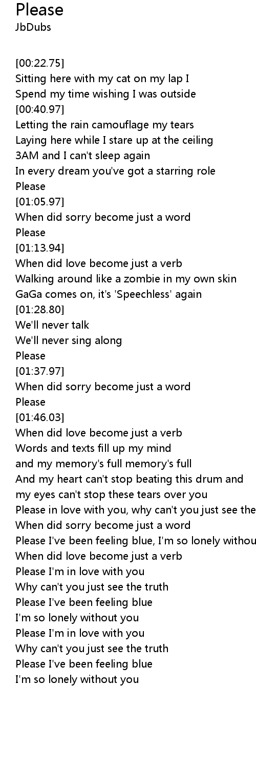 | [02:28.38] | Please I' ve been feeling blue, I' m so lonely without |