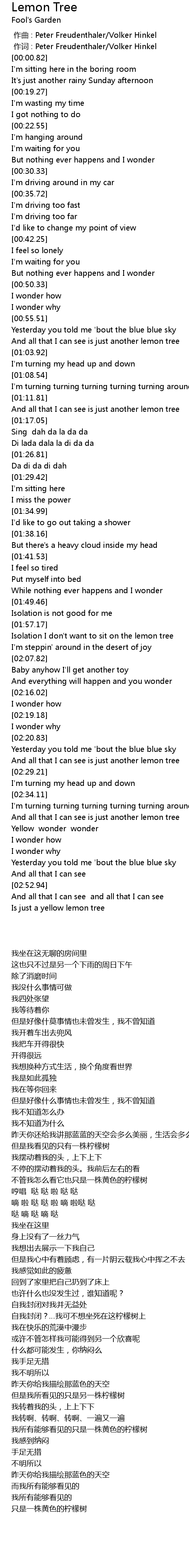 | [01:59.12] | Isolation I don' t want to sit on the lemon tree |