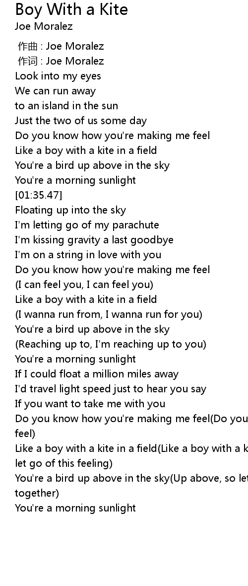 | [03:24.73] | Like a boy with a kite in a field Like a boy with a kite, I' ll never let go of this feeling |