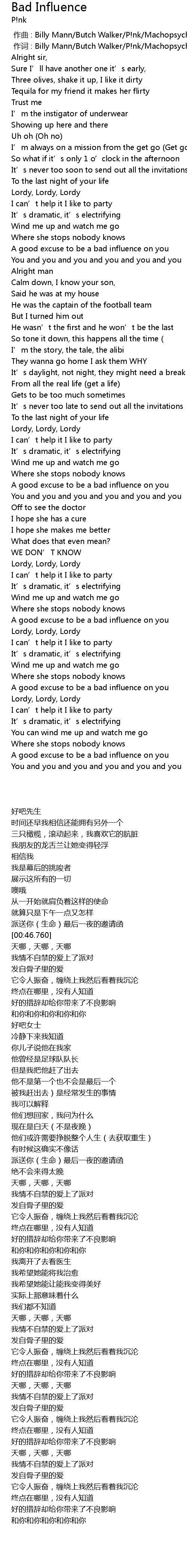 | [00:01.00] | 作词 : Billy Mann/Butch Walker/P!nk/Machopsycho |