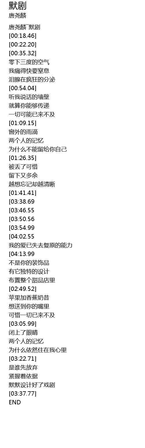 | [04:30.79][03:54.99][01:58.83] | 你演的默剧我会尽力让自己入戏 |