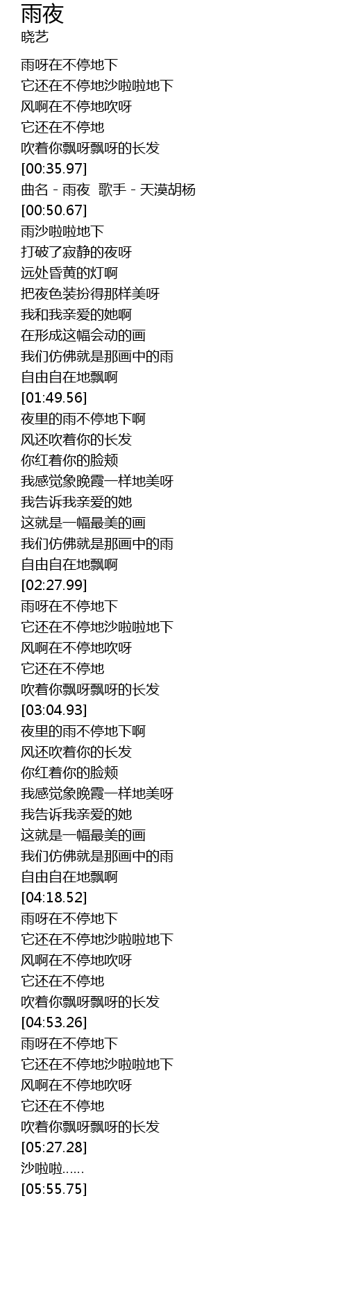 | [00:40.39] | 曲名-雨夜 歌手-天漠胡杨 |