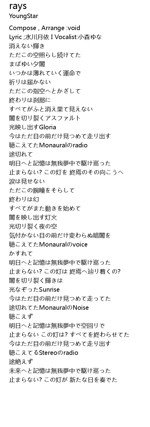| [00:20.91] | Lyric ;水川月依 I Vocalist:小森ゆな |
